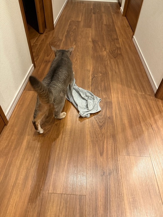 わが家では、着替えは慎重にしないとこんなことになるのです。 別の日に、餌食になったタンクトップ…寝る前に着替えようと、タンクトップに手を通した···