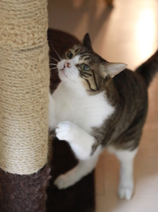 そろそろ猫らに晩ゴハンを用意する時間。まだ寝てるかな?なんて言っているのを聞きつけて起きてくるアミ姐さん。キッチン脇の爪みがきポールを 派手···