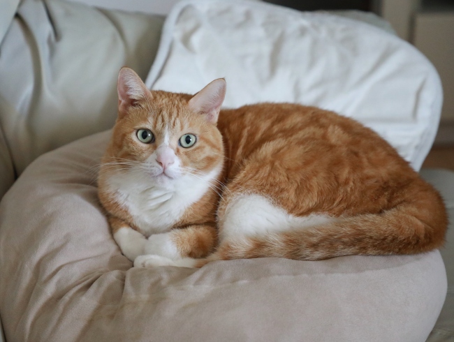 爪を切られたくなくて爪切り係のたけから逃げまくりだったユウ。 たけの留守中はたけクッションでくつろいでいますが 帰宅の気配を察知するとキャット···