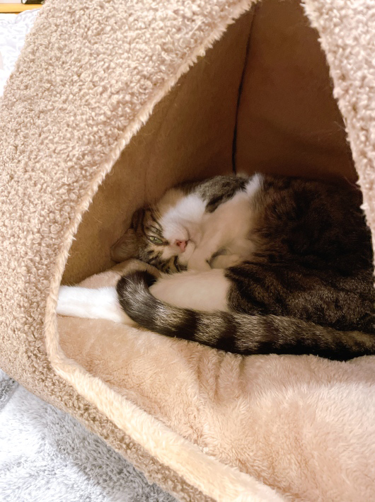 寝室のテントベッドをのぞいたら すやすや寝ていたアミ姐さん。アミの苦手なエアコンの涼風も避けられるので夏の間、もっと使われるかと思っていまし···