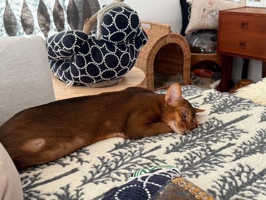 ソファーでりすたんが寝ていた。そっと座って、スヤスヤと眠るりすを眺めていた。はぁ、かわいい♡猫って寝てるだけなのに、飼い主を癒してくれますね···