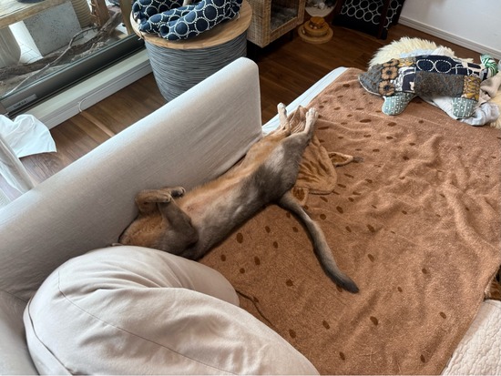 朝起きて、ソファーで見た光景。ぼくちんの首がない(´・_・`)あった。ソファーとヨギボーの間に埋まってた。前足縦に組んでる。いつも面白い寝相を見せ···