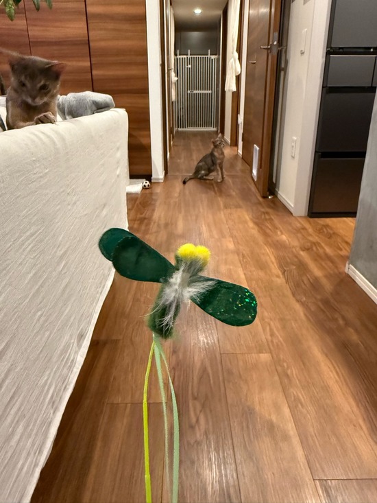 最近、このトンボのおもちゃが猫たちのブームになっている。特にぼくちんがお気に入り♪張り切ってトンボに飛びつこうとしたら、目の前にわか坊がいた···